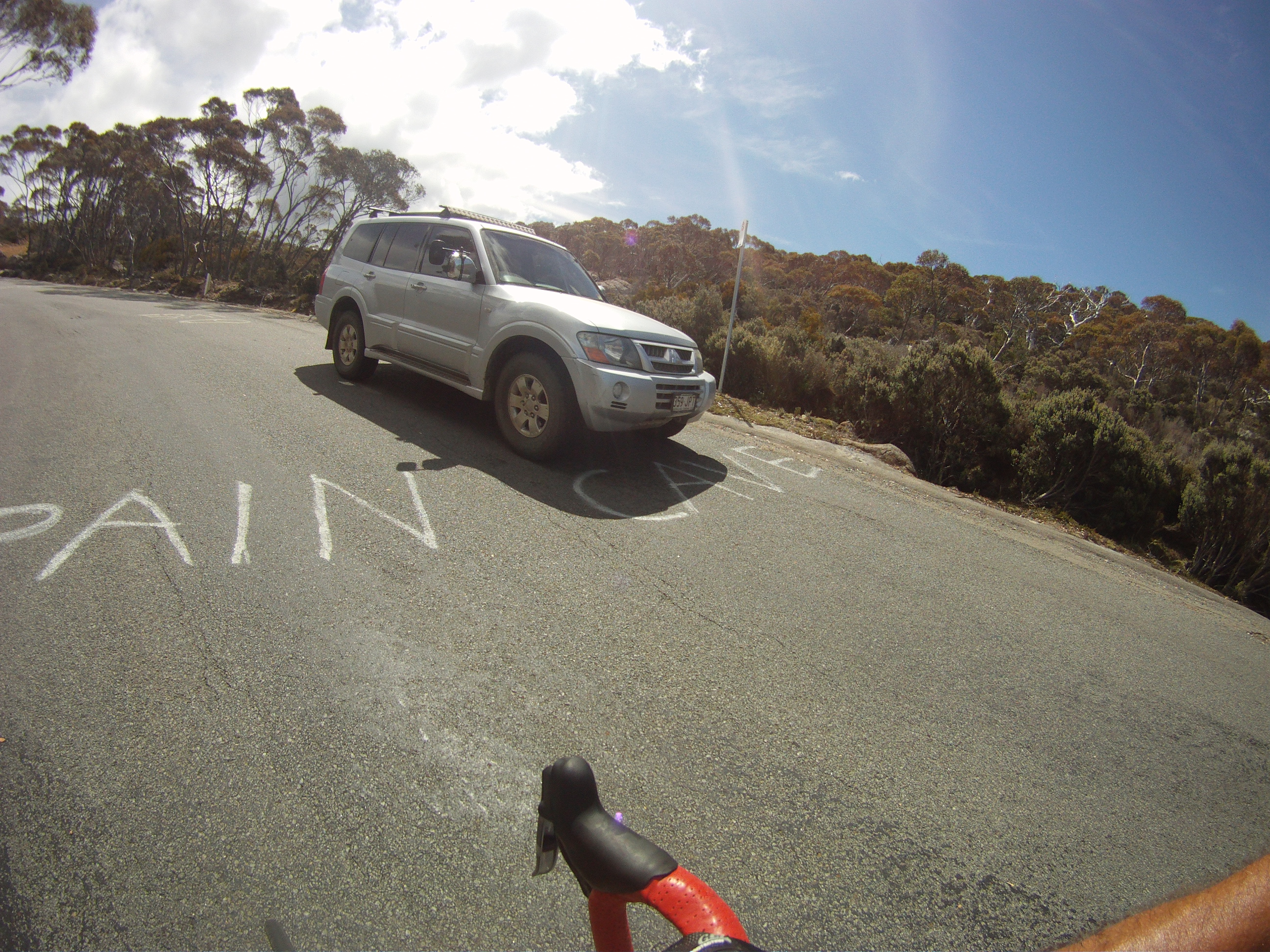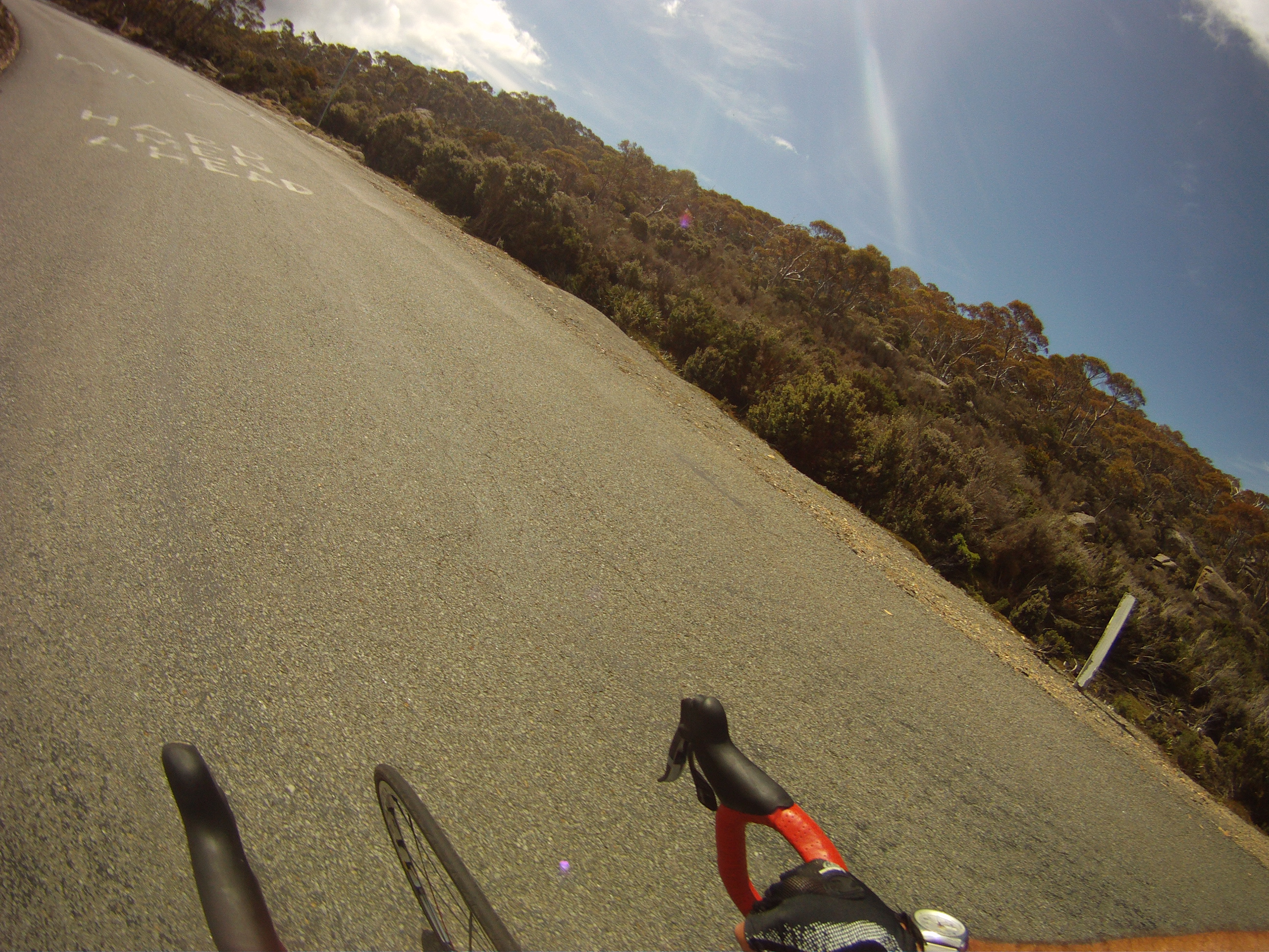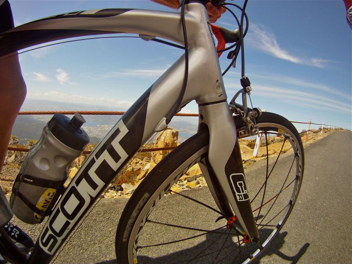 A welcome quiet country road on the outskirts of Hobart, several phone calls along the way in search of a mate (i.e. a sucker) to climb ‘the mountain’ with until the ever dependable Mr Revell obliged. The only issue for me was that he’s ‘Revell’ by name and ‘Rev’ by nature. I negotiated the spectacularly and equally unsafe steel encased bike path across the Tasman Bridge to rendezvous with Rev and off we set at a steady pace passing the temptation of the historic Cascade Brewery and into the 5-8% switchbacks that sweep 11Km upwards to Fern Tree. A right turn onto Summit Road and then the fun begins. A 10k grind to the top. The narrow road cuts a path through the wet Eucalypt forest and at 7km from the summit it gives way to sub-alpine growth as the road hugs tight under the rock climbing playground of the spectacular Organ Pipes. It is here that the climb really kicks into gear. The 9% gradient rises to 11% for 3-4 km. In keeping with his namesake Rev upped the cadence and left me to ‘dig fence post holes’ with every wincing pedal rotation. I was sporting a SRAM 28 but at that point in time I would have gladly put pride aside and swapped my cranks for a compact as well. I embraced the pain, grimaced a little more and sweated through to the summit and a smiling Rev, looking like he had just ridden from waterfront cafe to waterfront cafe. Can someone remind me why I am mates with him?